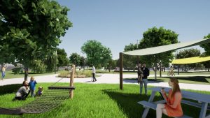 În partea de vest, locuitorii se vor bucura de foișoare, mese, hamace, podețe peste pârâu, cișmele de apă și structuri pentru umbrire, toate integrate într-un cadru natural prietenos.