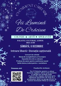 „Fii Lumină de Crăciun”  este un alt eveniment ce are loc sâmbătă, 6 decembrie, la Palatul Cultural de la Lupeni, intrarea fiind gratuită. Va fi un festival de colinde, artă și speranță.