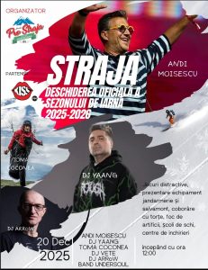 Haideți și la munte. Straja dă startul petrecerilor din această iarnă și ne invită să urcăm și să fim la altitudine. Sunt invitați: Andi Moisescu, Toma Coconea, care va veni în zbor, DJ Arrow și Undersol band. Petrecerea începe sâmbătă la ora 12,00 și puteți participa la jocuri distractive, demonstrații cu echipamente ale jandarmeriei și salvamontului, veți vedea, spre seară o coborâre cu torțe și un foc de artificii.