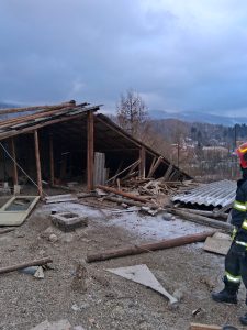 Ulterior, echipajele au fost solicitate la un alt bloc din municipiu, unde aproximativ 50 de metri pătrați din acoperiș se desprinseseră complet, iar restul învelitorii se afla în pericol de prăbușire. Salvatorii au intervenit pentru îndepărtarea învelitorii din azbociment și pentru fixarea elementelor de construcție rămase, astfel încât să fie eliminat riscul ca acestea să cadă pe trotuar sau pe carosabil.
